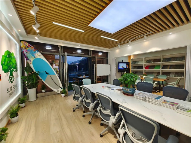 運營中心的內(nèi)部裝飾,充分融入品牌元素。采用思嘉超能芯鋪裝地面,以超能芯六邊形地板裝飾茶歇區(qū),以魚骨拼鋪法裝飾洽談區(qū),展現(xiàn)產(chǎn)品應用效果,為自己代言。